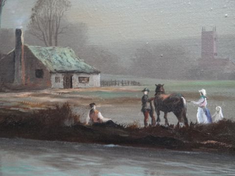 PETER COSSLETT oil on canvas - winter moonlit view of figures with horse on riverbank looking towards distant church and village, signed, 50 x 75cms Condition Report: no problems, please see further images