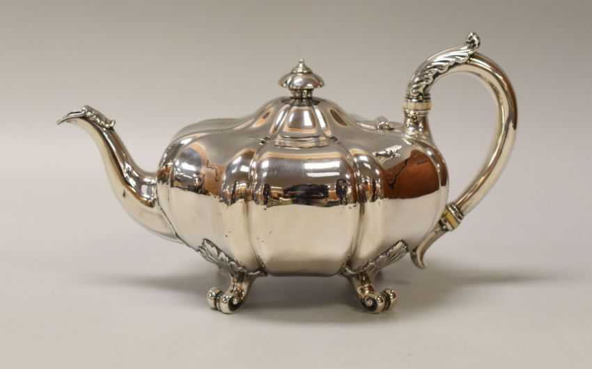 AN EARLY VICTORIAN MELON SHAPED SILVER TEAPOT on four scrolled acanthus supports, acanthus handle and spout, mark for John Mortimer & John Samuel Hunt, London 1841, 25ozs Condition Report: in excellent condition, no signs of repair, small dints commensurate with age