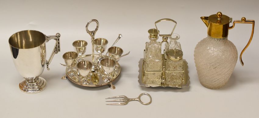 AN EPNS PARCEL OF EGG CADDY, CRUET SET & CUP together with a crackle glazed glass decanter and a toasting-fork