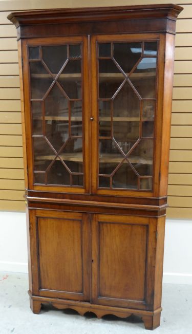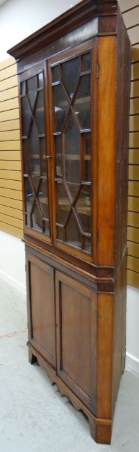 A TWO-DOOR MAHOGANY CORNER CABINET composed of base cupboard and top with astragal glazing and shaped interior shelves, 111cms wide