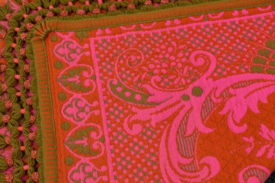 A SPANISH 'CASA PUPO' WOOL BLANKET in bright pink and green, 302 x 185cms