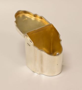 A SILVER CADDY MODELLED IN MINIATURE AS A GEORGIAN KNIFE-BOX of sloped and serpentine form with scrolling handle to the hinged lid and having a gilded interior, mark for Edward Souter Barnsley, Sheffield 1909, 3ozs