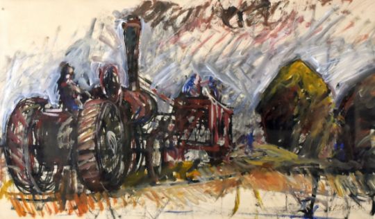 GERALD CAINS RWA acrylic, gouache and ink - steam tractor and threshing machine, entitled verso 'Threshing', singed and dated '91, 38 x 64cms
