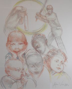 ANDREW VICARI colour print - two cricketers in action with portraits of children (the original drawn for the cricketing charity The Lord Taverners), signed and dated 2005, 75 x 61cms
