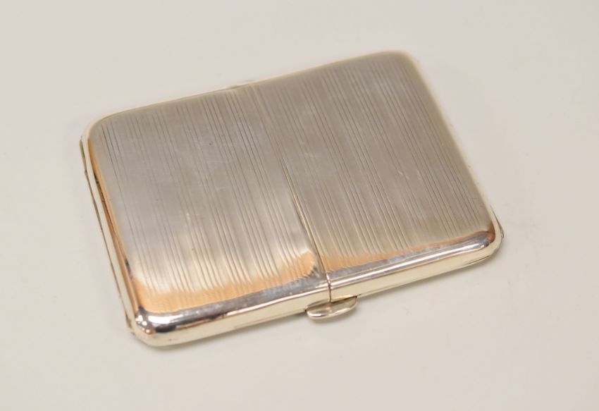 A SILVER CIGARETTE CASE opening with twin lids and machined with striping, Birmingham 1921, 5.9ozs gross