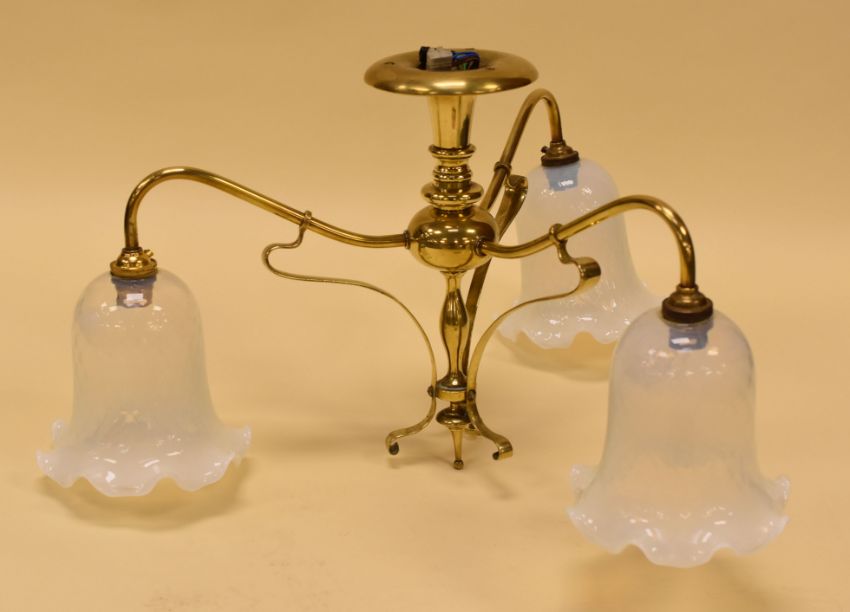 A GOOD ART NOUVEAU BRASS LIGHT FITTING having three branches with Vaseline glass pendant lights, height to ceiling 31cms Condition Report: the glass of each pendant in excellent condition, no damage or obvious repairs anywhere