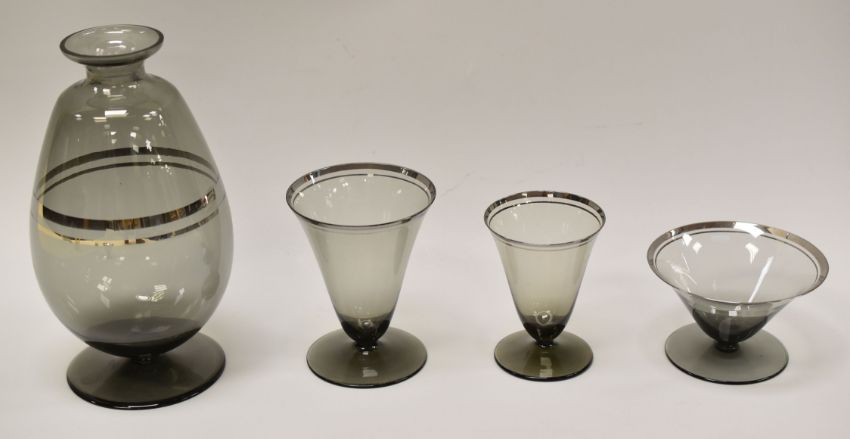 A SET OF CZECHOSLAVAKIAN DRINKING GLASSES combining twenty seven flutes in three sizes and ten champagnes with a footed decanter, labels on base
