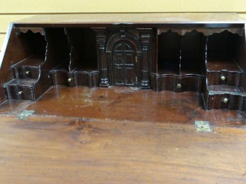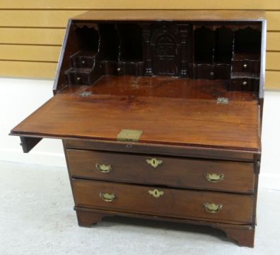 NINETEENTH CENTURY MAHOGANY BUREAU with sloped front and four graduated drawers all with brass fittings, the interior nicely fitted with a novelty centre door pigeon hole and with shaped drawers, 104 x 91cms