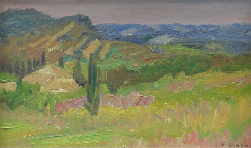FRANCOIS DIANA oil on board - with view across valley with mountains in background entitled 'Les Environs de Beaussel', dated 1965, signed, 32 x 54cms