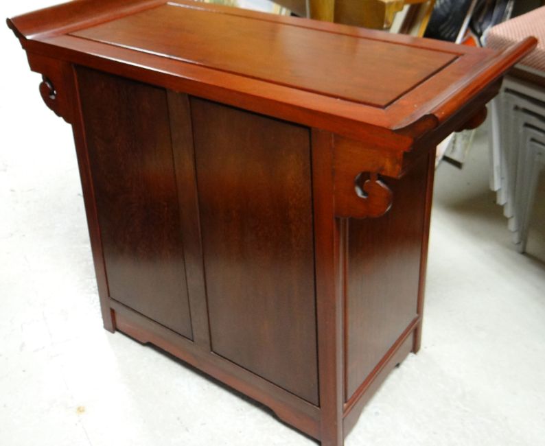 A MODERN CHINESE ROSEWOOD SIDE TABLE in the altar-style with cupboard doors and two drawers, 92cms wideAn import / export certidicate issues by APHA will be required for purchase outside the EU