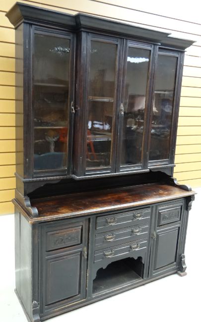 A STAINED OAK EDWARDIAN DRESSER composed of a base with dog kennel, three drawers and flanking cupboards and a fully glazed top, 154cms wide