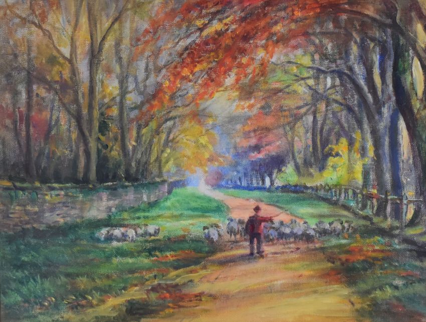 WILLIAM FIRTH oil on board - farmer driving sheep down a tree lined lane, 30 x 38cms Provenance: entered by granddaughter of the artist. William Firth was an artist and textile designer who supplied cloth used for the British Army uniforms in WWI.