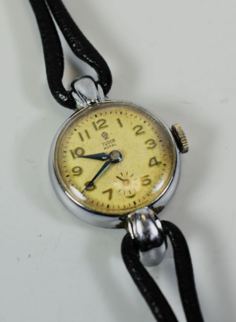A ROLEX TUDOR ROYAL LADIES WRISTWATCH having a circular white metal dial with Arabic numerals and on a non-conforming black leather strap