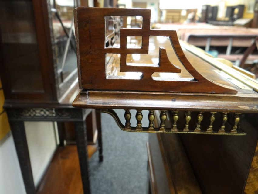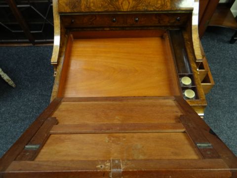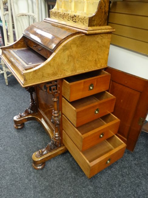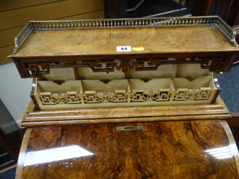 A VICTORIAN WALNUT DAVENPORT DESK having a concealed bank of four drawers to the side and with elevated pull-out tooled-leather desk and having a brass galleried top, 56cms wide Additional information / condition report: in excellent order, some fading but no notable damage except chips to fretwork on pop-up bureau (see additional images). The Davenport has a button inside the right drawer cavity which releases a secret bureau which pops up (please see images). We have searched for a maker’s label and stamp but there does not appear to be one present. Estimate revision £400-800