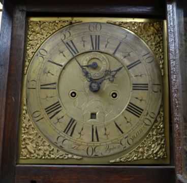 A MID TO LATE EIGHTEENTH CENTURY OAK LONGCASE CLOCK with eight day movement, the brass dial having Roman numeral chapter ring with filigree spangrels inscribed Thomas Ogden, Halifax, 221cms high