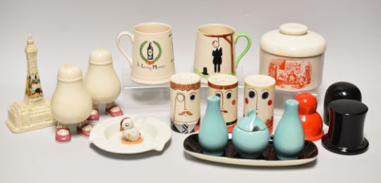 A PARCEL OF CARLTONWARE POTTERY including two 'Last Drop' hanging figure tankards, a pair of novelty salt and pepper pots with human-form feet, an earlier lustre Welsh Tea from Porthcawl souvenir, three piece condiment set etc