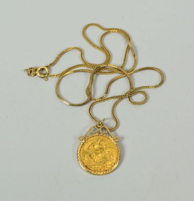 A GOLD HALF-SOVEREIGN mounted to a fine 9ct yellow gold necklace, approx 3.4gms (8.3gms total)
