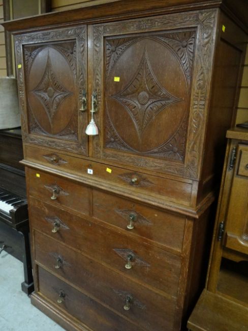 A vintage oak carved tallboy comprising three long and two short drawers, middle narrow drawer and two-door cupboard above with pigeon holesHeight – 182 cmsWidth – 107 cmsDepth – 51 cms