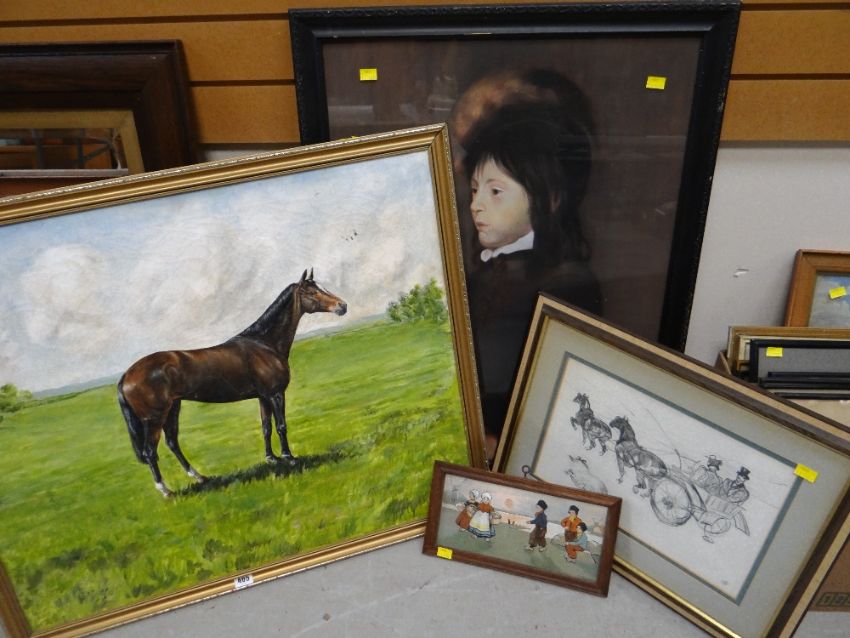 An oil on canvas of a standing horse, framed print of Dutch boys and girls by Ethel Parkinson etc
