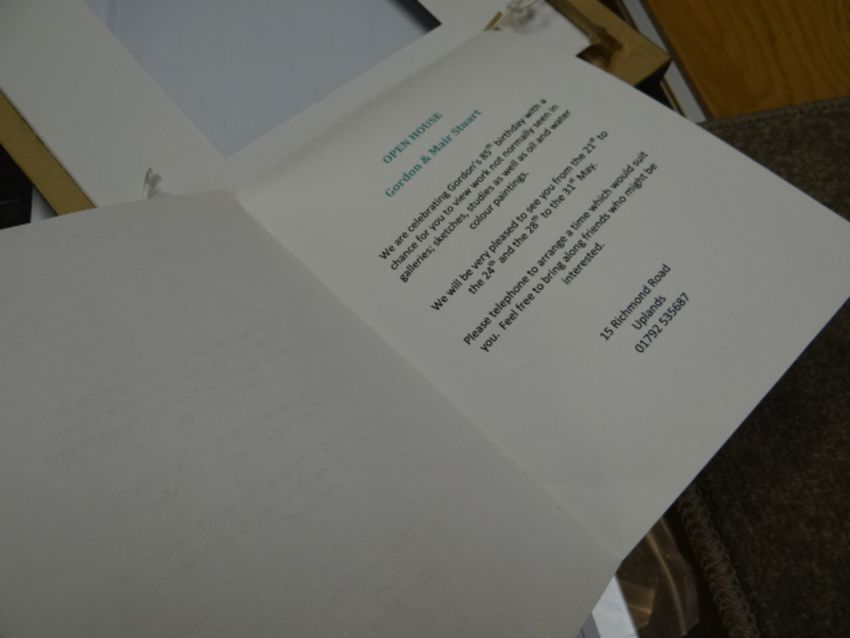 Two Gordon Stuart framed photocopies - figures with umbrellas Additional: the smaller of the two is a photocopied gallery invitation that has been framed, the larger is a photocopy aswell please see photographs