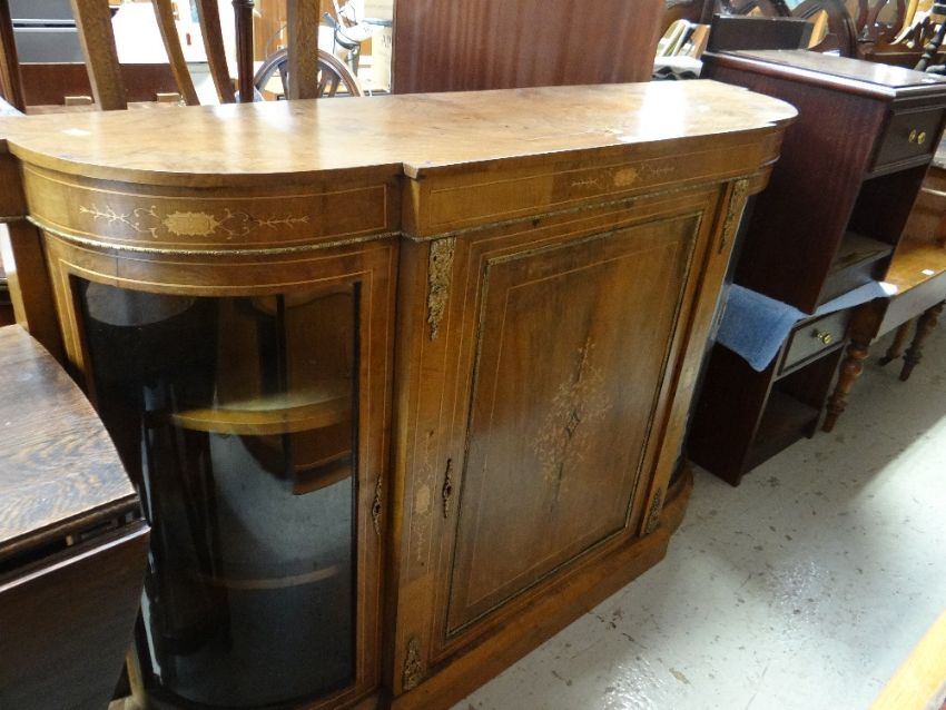 A late Victorian walnut credenza with curved glass side cabinets and centre single door cabinet and having ormolu mounts