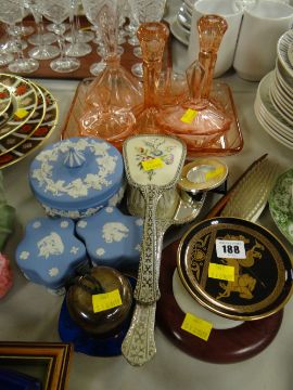 A tinted glass dressing table set, three items of Wedgwood Jasperware and sundry ornaments