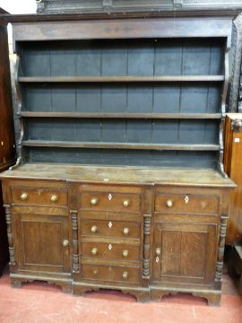 AN ANGLESEY OAK BREAKFRONT DRESSER, the three shelf backed boarded rack with inlaid diamond and star frieze decoration and shaped sides over a 'T' arrangement of six opening pine lined drawers with cockbeaded edges, diamond escutcheons and brass knobs along with two cupboard doors flanked by half cut turned pillar decoration, on a bracket foot base, 213 cms high, 170 cms wide, 55 cms deep maximum, (requiring restoration)