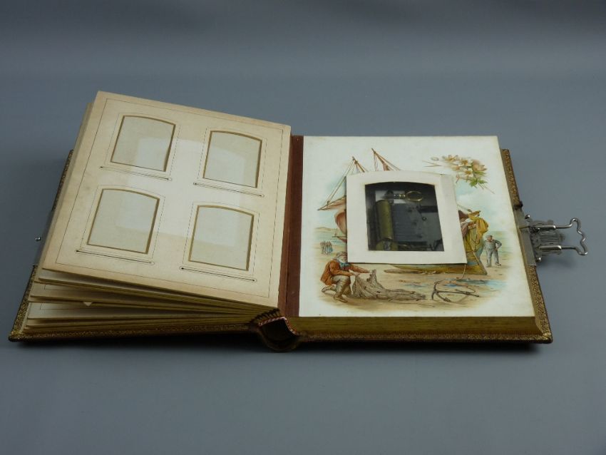 A SUPERBLY MAINTAINED EDWARDIAN MUSICAL PHOTO ALBUM, the front cover attractively decorated in gilt and incised leaf and floral decoration and with a white metal lyre clasp