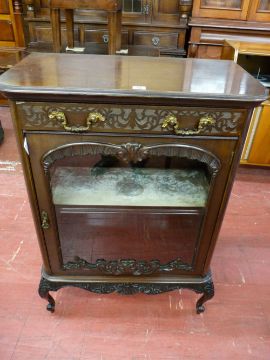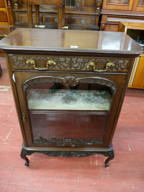 AN EDWARDIAN MAHOGANY SIDE CABINET, the single frieze drawer with blind fretwork decoration and Rococo style handles above a single glazed door with carved decoration and velvet covered interior shelf, shell patterned front apron on cabriole supports, 96 cms high, 69 cms wide, 38 cms deep
