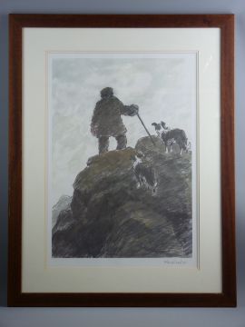 SIR KYFFIN WILLIAMS RA coloured print - farmer on a hilltop with his two sheepdogs, signed in full, 56 x 39 cms