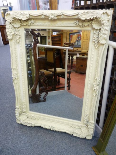 A REPRODUCTION PLASTER MOULDED FRAMED MIRROR with bevelled edge glass, 120 x 90 cms