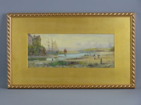 J HUGHES CLAYTON watercolour - shoreline scene with boats and cockle pickers, signed, 14 x 35 cms