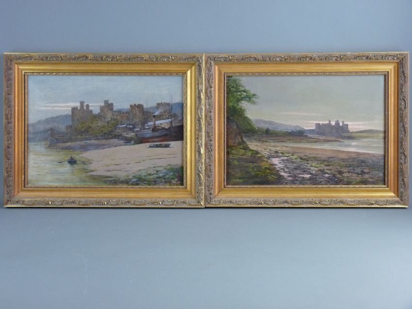 OILS ON CANVAS, a pair - Conwy Castle and surrounding area, indistinctly signed, 24 x 34 cms