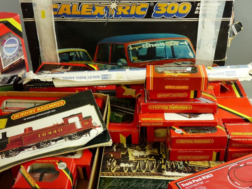 HORNBY RAILWAYS boxed Silver Jubilee Pullman set, along with other boxed carriages, rolling stock, track, turntable set and catalogues, with a boxed Scalextric 300 set
