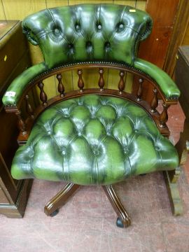 AN ANTIQUE STYLE CAPTAIN'S CHAIR in green button back leather effect upholstery, with a curved spindle back gallery on a swivel base stand, 62 cms wide maximum