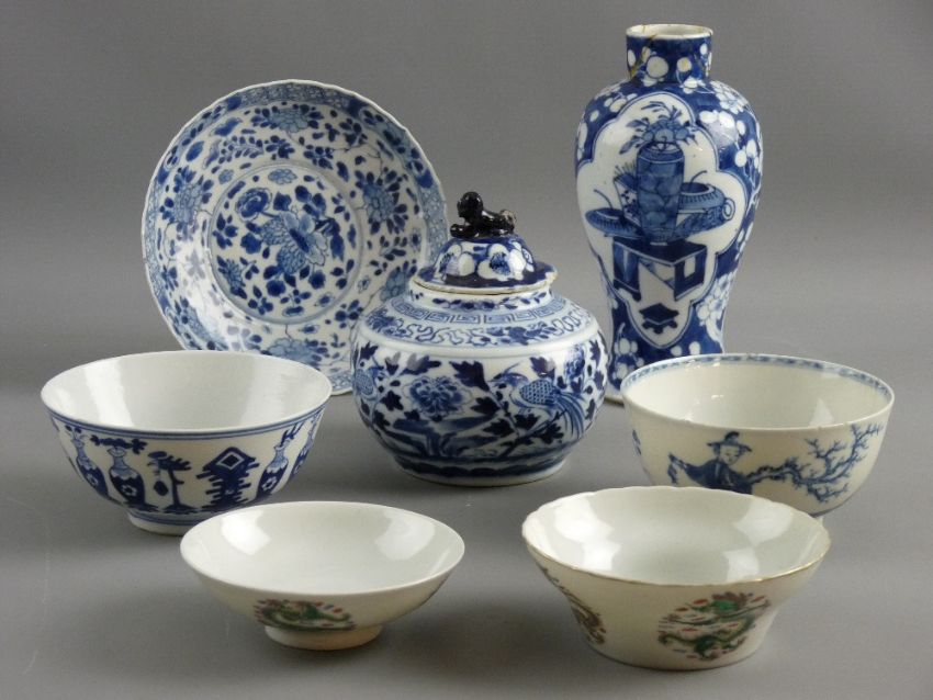 A COLLECTION OF 18th & 19th CENTURY CHINESE PORCELAIN to include two blue and white decorated tea bowls, a saucer, a squat vase and a lidded prunus decorated vase along with dragon decorated cup and cover in a Famille Vert palette, various patterns, sizes and character markings, (some chips and repaired damage)
