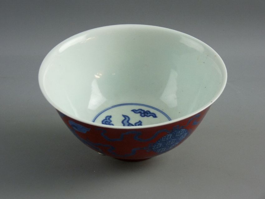 A CHINESE CORAL GROUND PORCELAIN BOWL decorated with underglazed blue mythical lions having ribbons in their mouths attached to decorative balls, the white interior with central underglazed blue pattern of flames within dual circular bands, the base with underglazed blue Qianlong seal mark, 9 cms high, 19 cms rim diameter