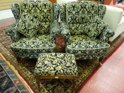 A PAIR OF REPRODUCTION WINGBACK ARMCHAIRS in the Victorian style in a black and light gold upholstery, on turned front supports with brass cup and castors, along with a similarly styled Stag footstool, 90 cms high, 83 cms wide maximum, 50 cms deep the armchairs