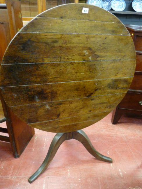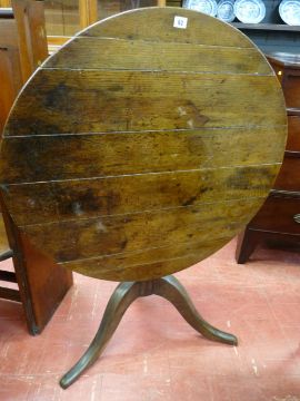 AN ANTIQUE OAK TILT TOP TRIPOD TABLE, the 82.5 cms diameter top on a turned column support with tripod legs, 72 cms high (care - sections at top loose)