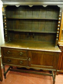 AN EARLY 20th CENTURY OAK DRESSER, the two shelf rack with central corbel supports on the shaped lower shelf flanked by turned pillar decoration, the base section with single cupboard door and two drawers having Arts & Crafts style handles raised on turned front supports with shaped front apron and cross stretchers, 195 cms high, 137 cms wide, 52 cms deep