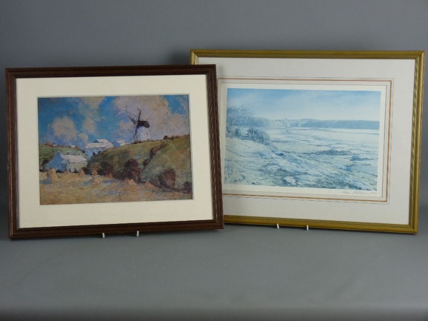 HARRY HUGHES WILLIAMS coloured print - Anglesey windmill with stooked corn, unsigned, 28 x 40 cms and IEUAN WILLIAMS coloured limited edition (213/350) print - the Menai Straits and Suspension Bridge, signed and dated 1995, 29.5 x 43.5 cms (faded)