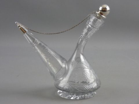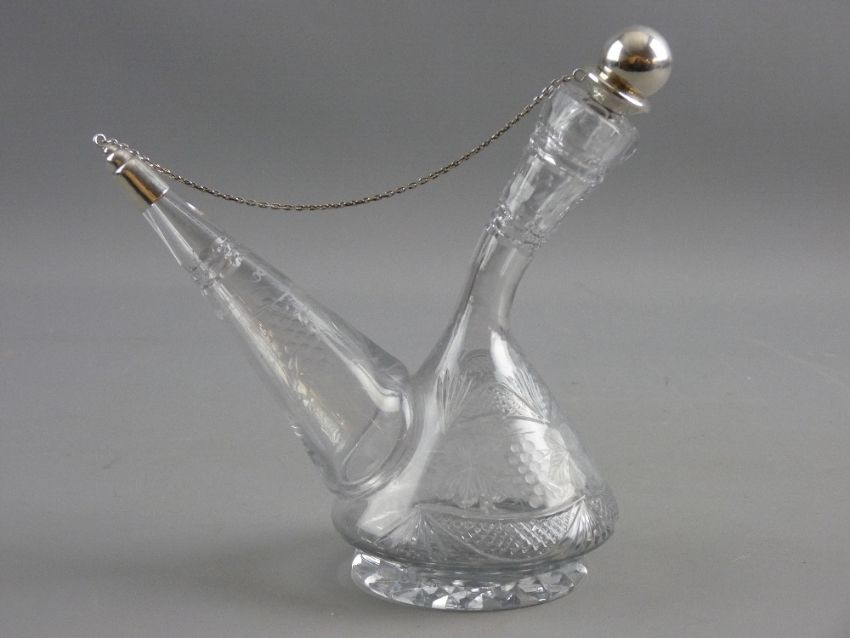 A CUT GLASS SPANISH WINE PORRON with silver mounted stoppers, the body facet and cross hatch cut with additional grape and vine leaf decoration, the metalware with Barcelona marks, circa 1940, 19.5 cms high, the base starcut with polished pontil