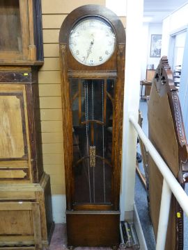 AN ART DECO OAK CASED TRIPLE WEIGHT LONGCASE CLOCK, the arched top case having a long front door with concave circular glass dial viewer and applied lower section decoration, the circular dial set with chrome Arabic numerals and hands, triple chain chromed three weight pendulum driven chiming movement striking on rods, pendulum and weights included, 185 cms high, 42 cms wide