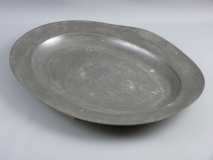 A LATE 18th/EARLY 19th CENTURY OVAL PEWTER MEAT PLATTER with semi-legible London touch marks to the rim at the rear, 52 x 39 cms