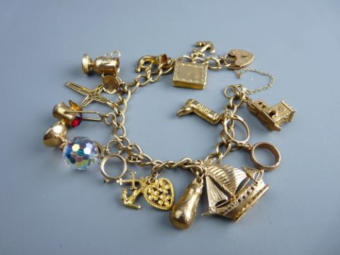 A NINE CARAT GOLD LINK CHARM BRACELET with safety chain and padlock and approximately fourteen charms, majority gold, 33 grms