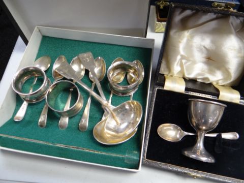 A parcel of silver tableware including a set of six monogrammed tea spoons, a pair of silver monogrammed soup ladles, three silver napkins rings and a cased egg cup and spoon set