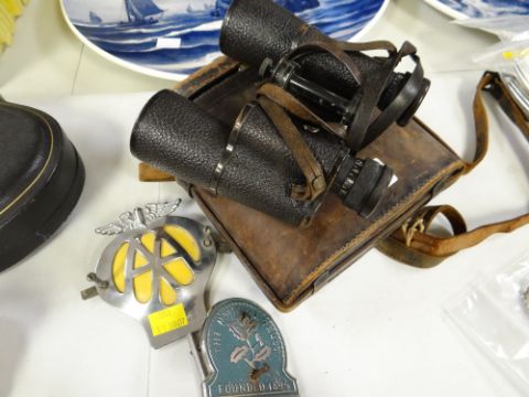 A cased set of vintage Carl Zeiss binoculars and two motoring grill badges