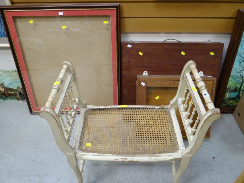 A French painted cane work stool together with two wooden / glazed display cases