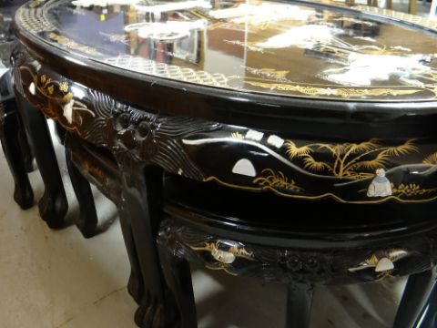 A late twentieth century fancy oval Japanese-style nest of tables in black lacquer with mounted figures and pagoda building etc