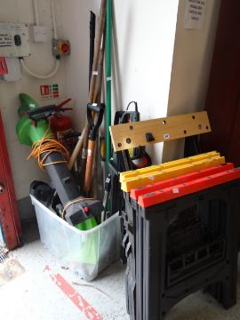 A quantity of items from the garage part of a house clearance including garden blower, garden tools, trestles etc